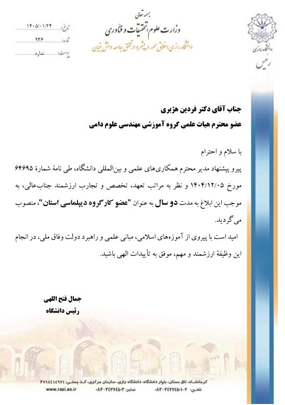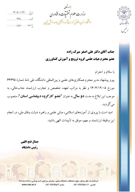 طی صدور احکامی از سوی رئیس دانشگاه رازی، دکتر فردین هژبری و دکتر علی اصغر میرک زاده