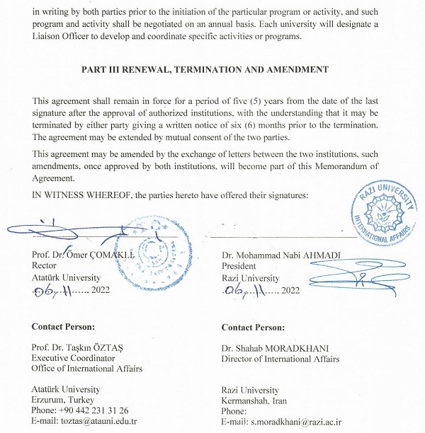 در راستای گسترش همکاری‌های علمی بین‌المللی، دانشگاه‌های رازی و آتاتورک تفاهم ‌نامه همکاری امضا کردند.