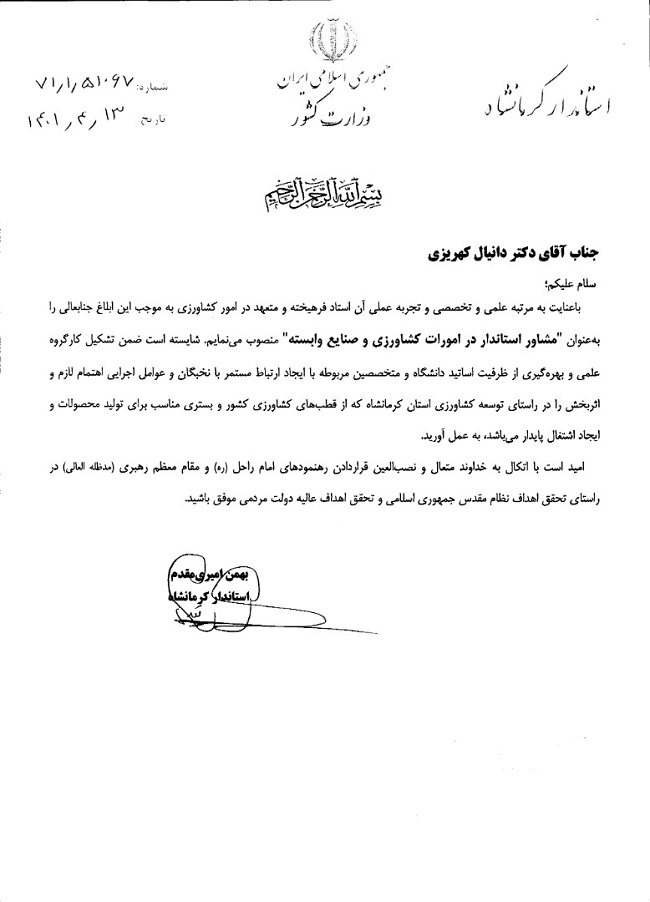 انتصاب دکتر کهریزی به عنوان "مشاور استاندار کرمانشاه در امورات کشاورزی و صنایع وابسته"