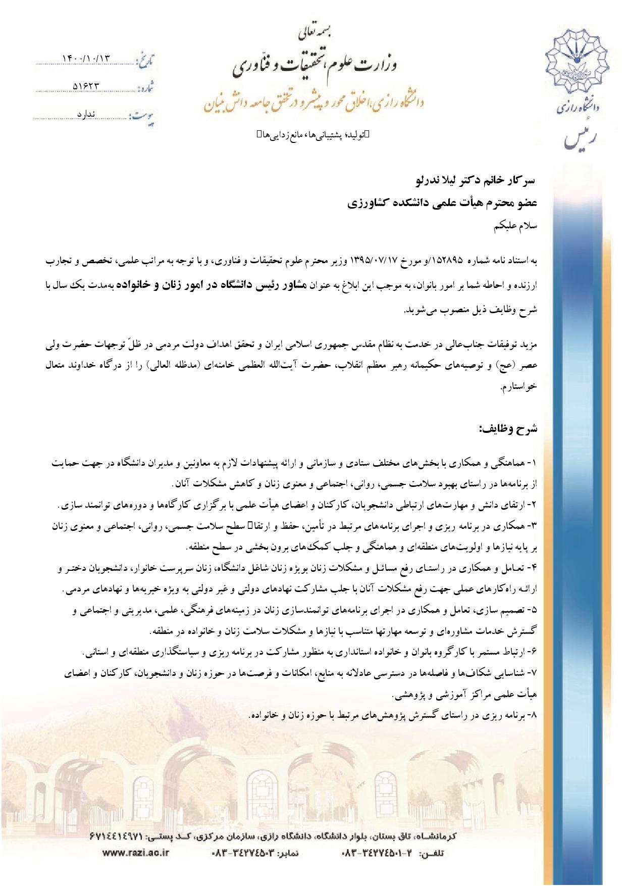 سرپرست دانشگاه رازی، در حکمی دکتر لیلا ندرلو را به عنوان مشاور رئیس دانشگاه در امور زنان و خانواده منصوب کرد.