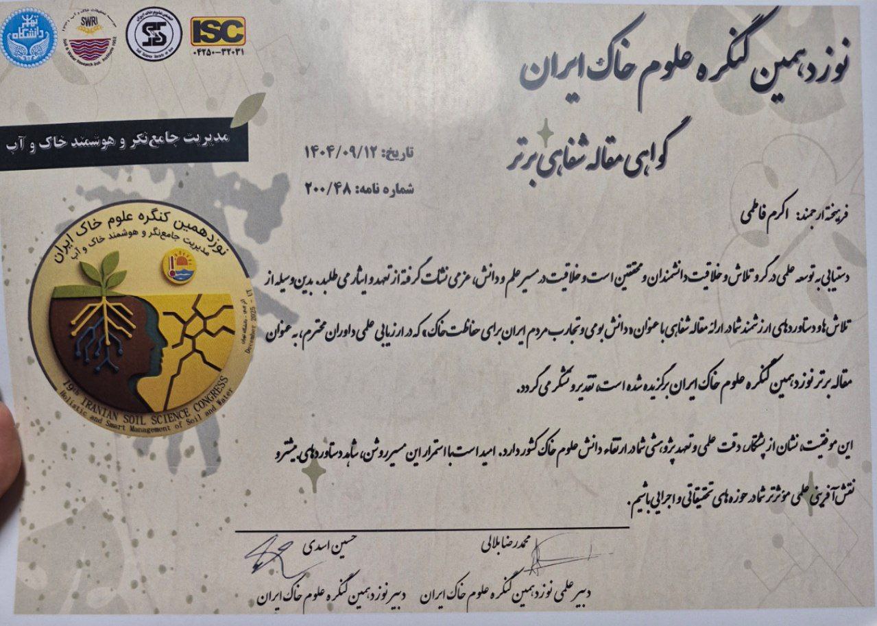 همچنین، سخنرانی ایشان با عنوان «دانش بومی و تجارب مردم ایران برای حفاظت خاک»، از سوی داوران کنگره، به عنوان مقاله برتر نوزدهمین دوره این کنگره علمی برگزیده شد.