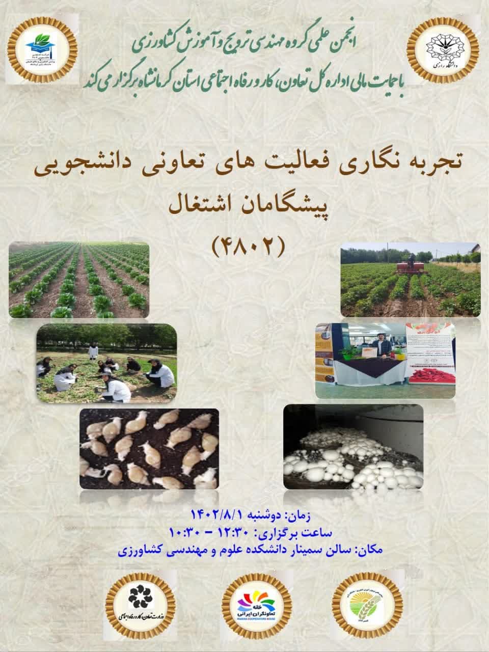 2595 انجمن علمی ترویج و آموزش کشاورزی برگزار میکند تجربه نگاری فعالیت های تعاونی دانشجویی پیشگامان اشتغال(4802) تجربه نگاری فعالیتهای تعاونی دانشجویی پیشگامان اشتغال(۴۸۰۲) تاریخ: ۱/ آبان / ۱۴۰۲...
